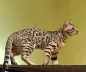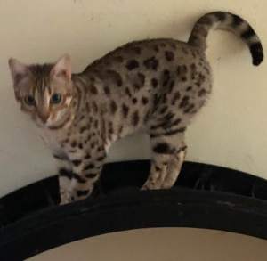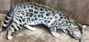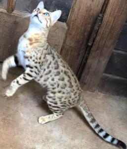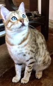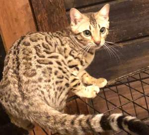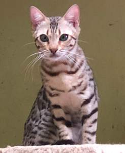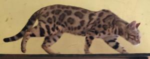 Another Malala daughter, Edggy is a very exotic looking cat with prominent goggles around her large rounded eyes, broad round muzzle, and small well-cupped ears. Head same diameter as neck, powerful body with curved topline and low carried tail.