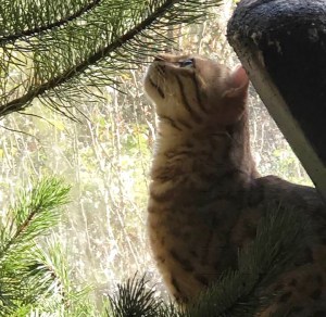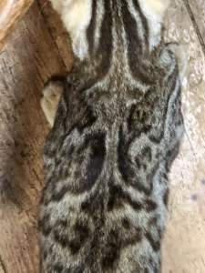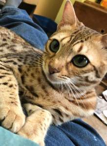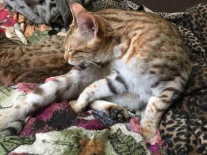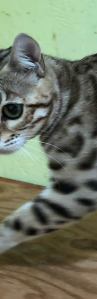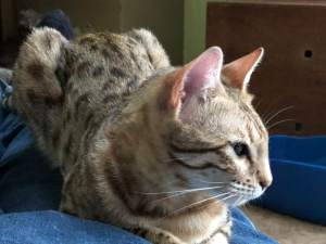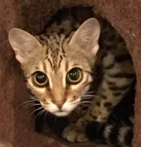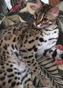 Full sister to Chia….amazing! Dark Brown & Black markings. Most unusual shoulder markings I have ever seen. When some trait shows up like this I think the best response is to follow the crumbs from the Bengal gods….and see where it takes you. Curved top line and thick tail almost always carried low. Well cut-in below her cheek bones, large rounded nocturnal eyes; head same diameter as neck.