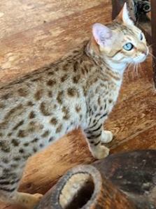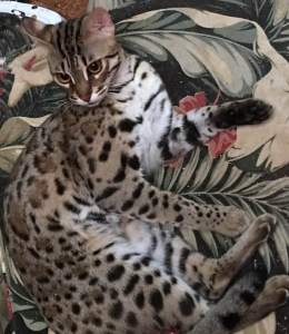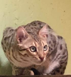 River is a very friendly female who has a beautiful head, wonderful cupped and rounded ears, large nocturnal eyes, medium ‘contemporary’ rosettes and surprise! has a very ALC whited underbelly “Fore & Aft” or “Hourglass” while under her ribcage is cream at 17 months, adding to the mystery of ALC Whited Expression inheritance. Looking forward to her kittens and the challenge to increase the amount of Whited Expression.