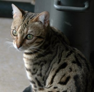 Joey Rico is an outcross male who is from my friend Bonnie Tanner of Junglekatz Bengals. Sweet Joey brought an extreme profile, ALC ears, and whited genetics to our program. He is down from our ALC Phantom descent starting from my F2 Joykatz Cerinthe, bought in 1995. Bonnie got one of Cerinthe’s F3s, RainForest Vada. who then produced a fertile F4 boy, Junglekatz Darth Vader. His son was Bonnie’s wonderful JungleKatz Ocelot and Joey Rico is his son, half brother to JK Chunky Moto. ALC Phantom descents have produced some of the best Whited Expression in the breed, including the work done at Rosetta Bengals by Lisa Arvay.