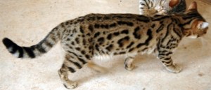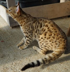 Amazingly, 6th generation Joey Rico has the exact same ALC spotted chest that his great great grandmother, my F2 Cerinthe had. It a very rare trait in the SBTs. Joey also has the same ALC-like ears as my homebred 5th generation Phantom line queen, RF Zuri Pakka. …and……He carries his tail mostly low.