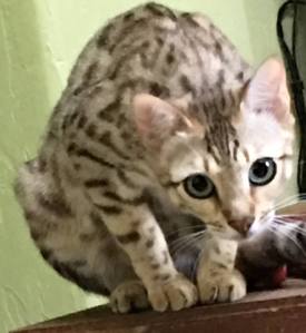 This wonderful girl is one of the best. She is an F4 generation cat, as descended from ALC Phantom and seventh generation Kabuki SBT.