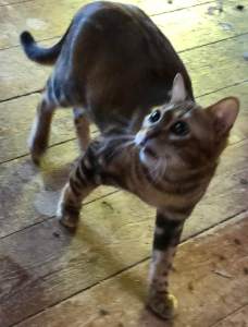 I will always be very grateful for Marianne Blaire’s kindness and generosity for the opportunity to work with this blood line. Yaba Du is from a repeat breeding of Marianne’s Baddabing Bengal kittens who won On Safari Best kitten awards in Portland in 2015. Yaba Du is a sweet cat, with very cupped & rounded small ears, small wild cat style head and nice rosetted pattern, She is retired and looking for her furrever home.